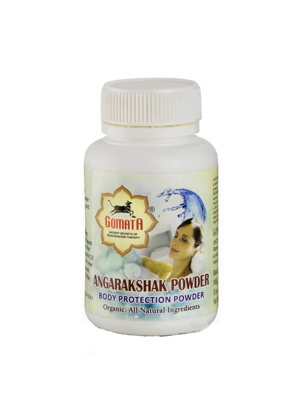Ангаракшак чурна Гомата - сильный противовоспалительный, очищающий и защищающий порошок. Этот порошок защищает кожу от различных кожных заболеваний, инфекций, шлаков, загрязнений, агрессивного воздействия окружающей среды, причем даже химического и радиационного. Повышает тонус кожи.