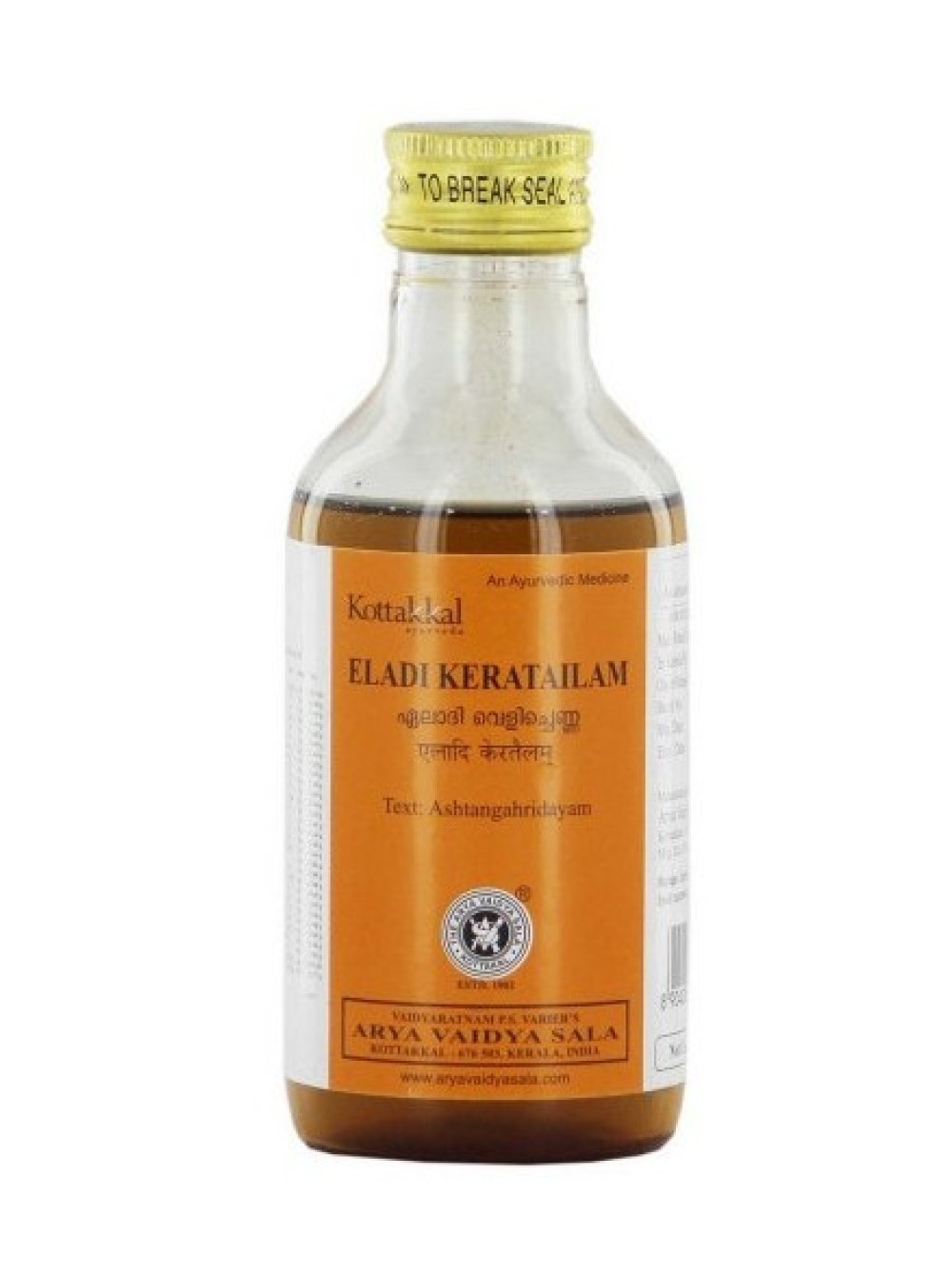 Состав: Keratailam (Cocos nucifera) 10,000 ml; Ela (Elettaria cardamomum) 0,044 g; Sthulela (Amomum subulatum) – 0,044 g; Turushka (Boswellia serrata) 0,044 g; Kushta (Saussurea costus) 0,044 g; Phalini (Callicarpa macrophylla) 0,044 g; Mamsi (Nardostachys jatamamsi) 0,044 g; Jala (Plectranhus vettiveroides) 0,044 g; Dhyamaka (Cymborogon martini) 0,044 g; Sprikka (Schizachyrum exile) 0,044 g; Choraka (Kaempferia galanga) 0,044 g; Chocha (Cinnamomum verum) 0,044 g; Patra (Cinnamomum tamala) 0,044 g; Tagara (Valeriana jatamansi) 0,044 g; Sthowneya (Saussurea costus (Sub)) 0,044 g; Jati (Myristica fragrans) 0,044 g; Rasa (Commiphora myrrha) 0,044 g; Sukti (Pearl oyster) 0,044 g; Vyaghranaka (Shell) 0,044 g; Surahwa (Cedrus deodara) 0,044 g; Srivasaka (Pinus roxburghii) 0,044 g; Chanda (Costus speciosus) 0,044 g; Guggulu (Commiphora mukul) 0,044 g; Devadhupa (Shorea robysta) 0,044 g; Khapura (Boswellia serrata) 0,044 g; Punnaga (Calophyllum inophyllum) 0,044 g; Nagahwa (Mesua ferrea) 0,044 g; Kerakshira (Cocos nucifera) 10,000 ml; Kumkuma (Crocus sativus) 0,017 g.