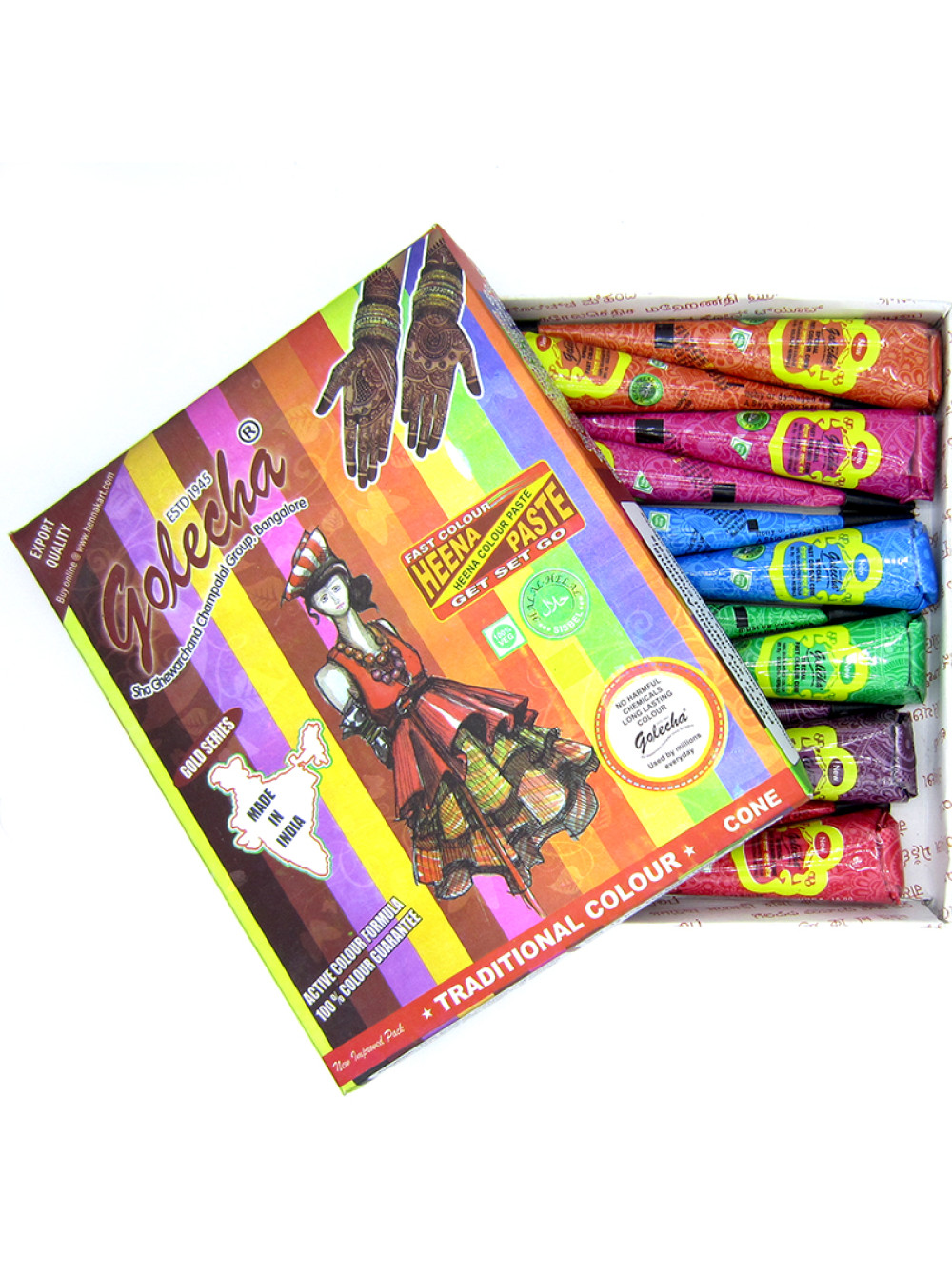 Хна для мехенди в конусах цветная Голеча - средство для нанесения рисунков на кожу, которое полностью готово к употреблению и не требует дополнительного разведения водой. Не содержит аллергенов, таких как ПФДА (PPD).