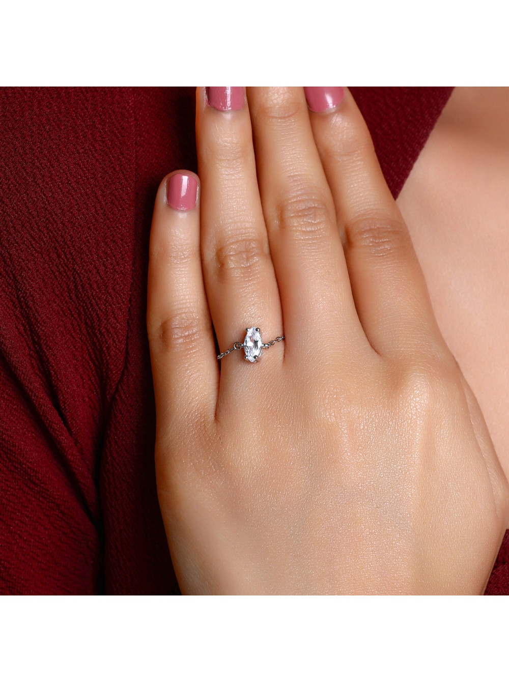 Дизайн: Современная шинка, имитирующая плетение цепи, с центральным акцентом в виде белого кубического циркония овальной огранки. Такое сочетание текстурного металла и классического сияющего камня делает украшение подходящим как для стиля Gen Z, так и для элегантных вечерних образов.