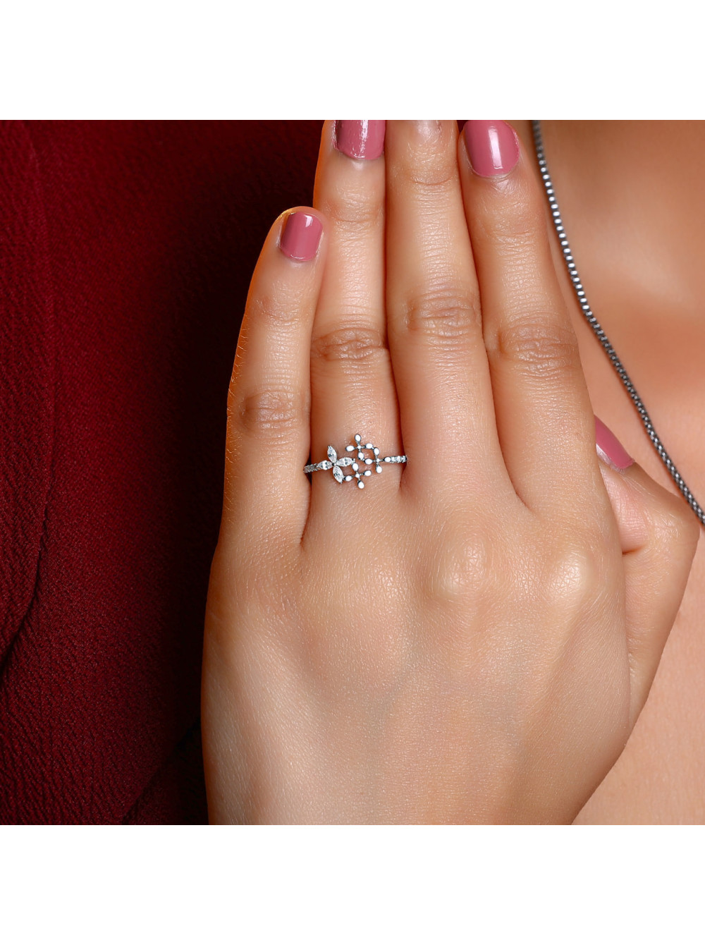 Лаконичное кольцо с флористическим акцентом, предназначенное для повседневного ношения или дополнения вечернего образа. Концепция дизайна строится на сочетании детализированного литья в форме лепестков и центральной вставки, которая эффективно преломляет свет. Благодаря классической стилистике, украшение легко комбинируется с другими аксессуарами из серебра, сохраняя актуальность вне зависимости от трендов.