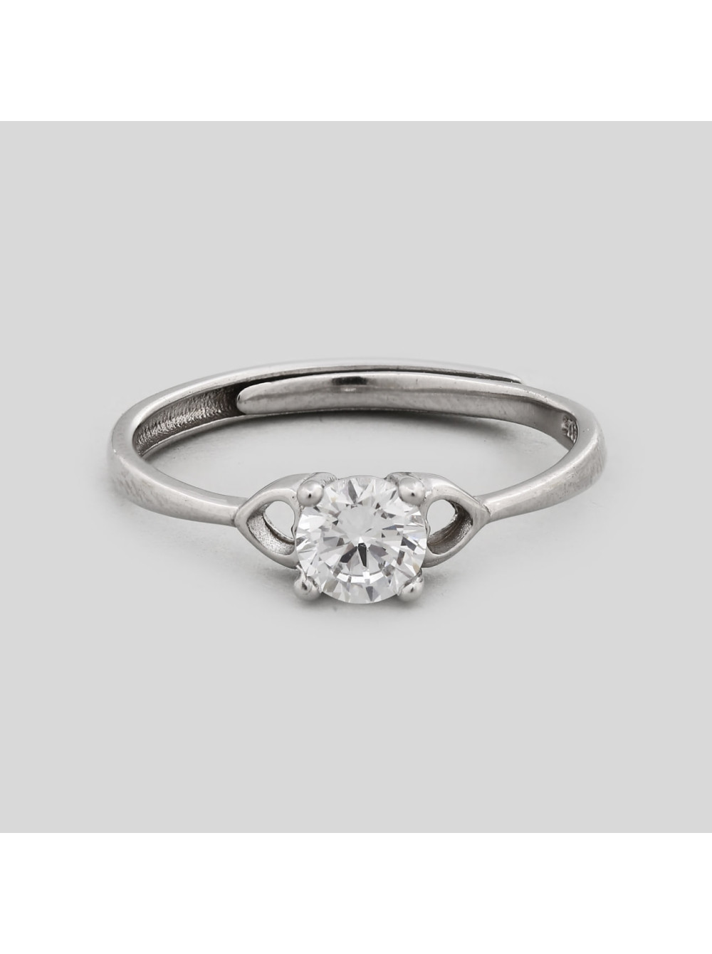 Дизайн: Одиночный крупный фианит (кубический цирконий) круглой огранки в классической крапановой закрепке. Тонкий ободок с деликатным узлом/петлей у основания камня придает модели уникальность при сохранении строгого силуэта.