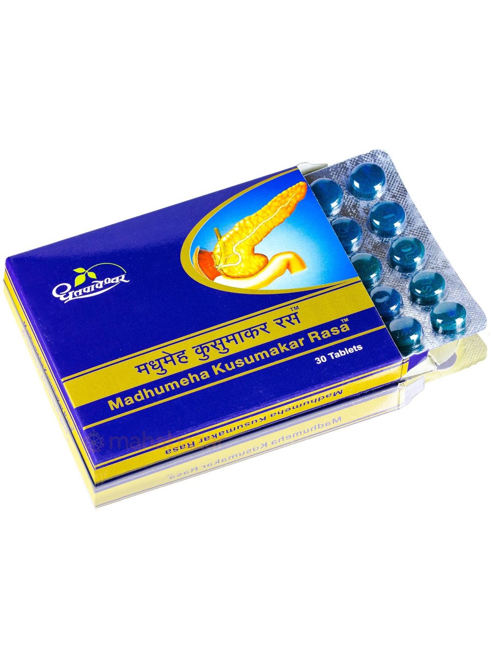 Состав: Vasant Kusumakar Rasa (Suvarnayukta) 10mg, Shodhit Shilajatu 40mg, Yashada bhasma 5mg, extract derived from Mamajjaka (Enicostemma litorale) whole plant 300mg and choorna of Haridra (Curcuma longa) rhizome 50mg, Amalaki (Emblica officinalis) fruit pericarp 50mg, Guduchi (Tinospora cordifolia) stem 50mg, processed in Bilva (Aegle marmelos) leaf swaras q.s., Asana (Pterocarpus marsupium) heart wood kwath q.s., Colours used: Brilliant blue FCF, Indigo carmine, Titanium dioxide, Preservatives used: Sodium methyl paraben, Sodium propyl paraben.