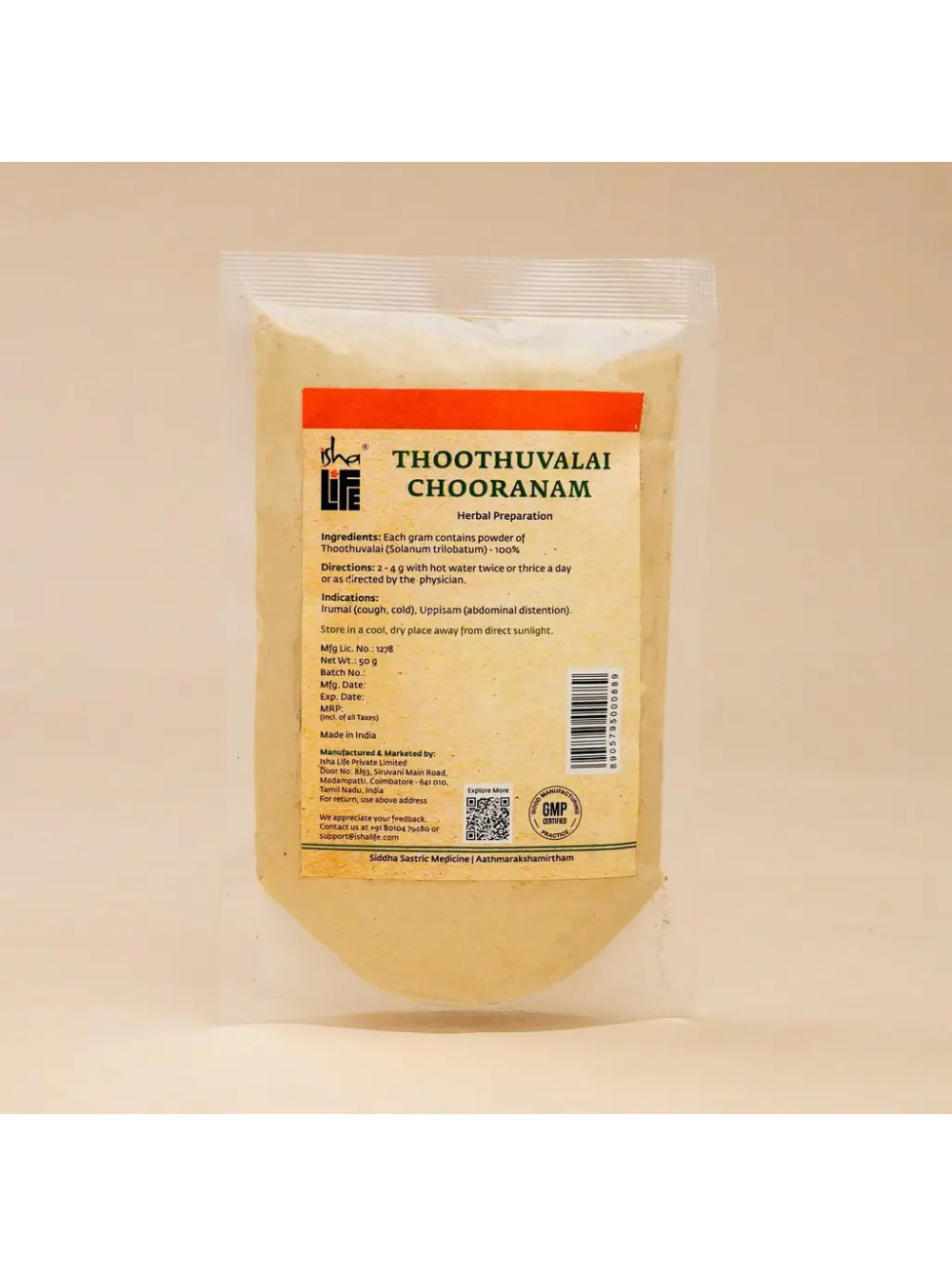 В состав Thuthuvalai Chooranam входят тщательно отобранные травы и растительные компоненты, известные своими целебными свойствами. Точный состав указан на упаковке.