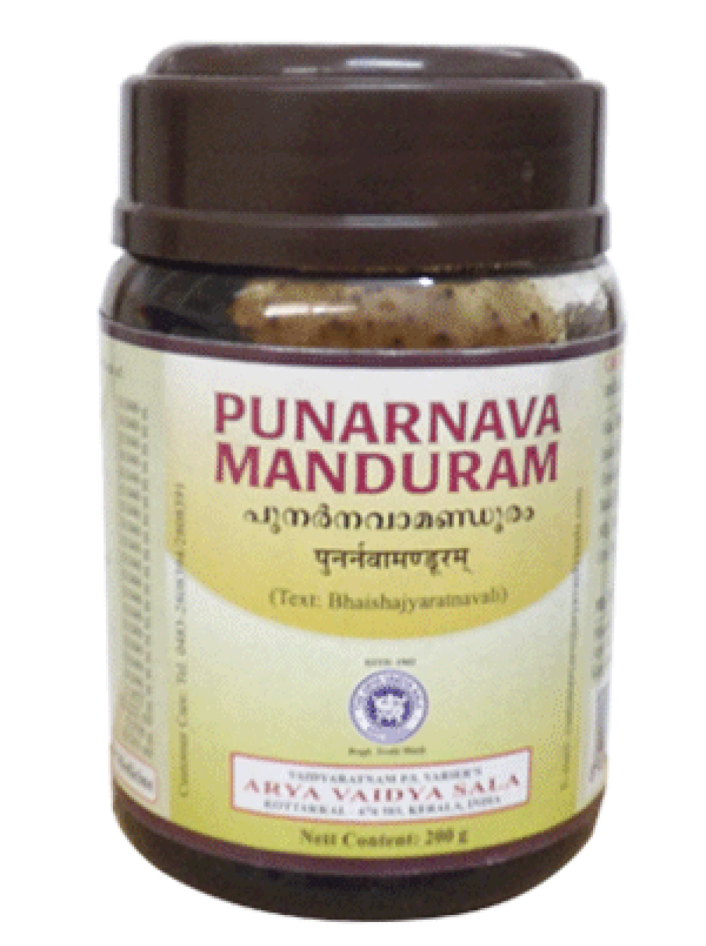 Состав Пунарнава Мандурам: каждые 10 г препарата содержат: Пунарнава (Boerhavia diffusa) - 0.046 г, Турпет (Operculina turpethum) - 0.046 г, Имбирь (Zingiber officinale) - 0.046 г, Чёрный перец (Piper nigrum) - 0.046 г, Пиппали (Piper longum) - 0.046 г, Эмбелия кислая (Embelia ribes) - 0.046 г, Кедр гималайский (Cedrus deodara) - 0.046 г, Читрак (Plumbago zylanica) - 0.046 г, Кушта (Saussurea costus) - 0.046 г, Золотой турмерик (Curcuma longa) - 0.046 г, Барбарис индийский (Berberis aristata) - 0.046 г, Харитаки (Terminalia chebula) - 0.046 г, Бибхитаки (Terminalia bellirica) - 0.046 г, Амла (Emblica officinalis) - 0.046 г, Данти (Baliospermum montanum) - 0.046 г, Перец чаба (Piper mullesua) - 0.046 г, Холорена пушистая (Holarrhena pubescens) - 0.046 г, Огурец змеевидный (Trichosanthes cucumerina) - 0.046 г, Пиппали (Piper longum) - 0.046 г, Муста (Cyperus rotundus) - 0.046 г, Мандура Бхасма (Ferrum oxydulatum) - 1.852 мг, Очищенная коровья урина (Cow urine) - 22.222 мл, Сахарный тростник (Saccharum officinarum) - 5.556 г, Макшик Бхасма (CuFeS2) - 0.741 мл.