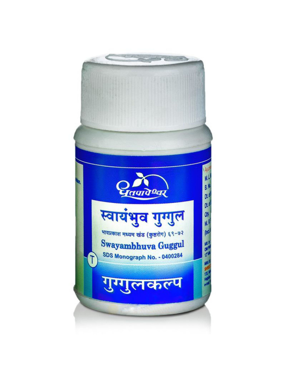 Состав: Shashilekha – Bakuchi – Psoralea corylifolia – 5 Pala – 240 g, Girija – Shilajeet – 240 g, Guggulu – Commiphora mukul – 480 g, Tapya – Swarna Makshika Bhasma – 3 pala – 144 g, Lohabhasma – 2 Pala – 96 g, Sravani – Mundi – Sphaeranthus indicus – 96 g, Triphala – Amla, Haritaki, Vibhitaki – each – 48 g, Karanja Pallava – Pongamia pinnata leaves – 48 g, Khadira – Gum acacia – Acacia catechu – 48 g, Guduchi – Tinospora cordifolia – 48 g, Trivrit – Operculina turpethum – 48 g, Danti – Baliospermum montanum – 48 g, Musta – Nut grass (root) – Cyperus rotundus – 48 g, Vidanga – False black pepper – Embelia ribes – 48 g, Rajani – Turmeric – 48 g, Kutajatwak – Bark of Holarrhena antidysenterica – 48 g, Nimba – Neem Bark – 48 g, Vahni – Chitraka – Leadwort – Plumbago zeylanica – 48 g, Sampaka – Amaltas – Cassia fistula – 48 g.