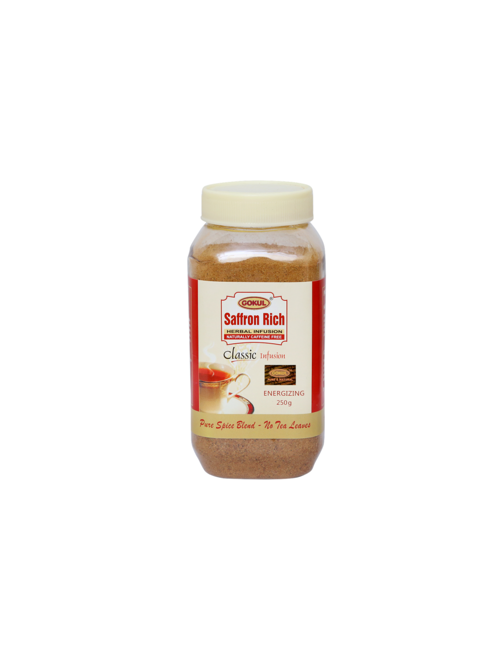 Состав чая с шафраном Гокул: Имбирь (Zingiber officinale), Корица (Cinnamomum verum), Кардамон (Cardamomum), Черный перец (Piper nigrum), Гвоздика (Syzygium aromaticum), Шафран (Crocus).