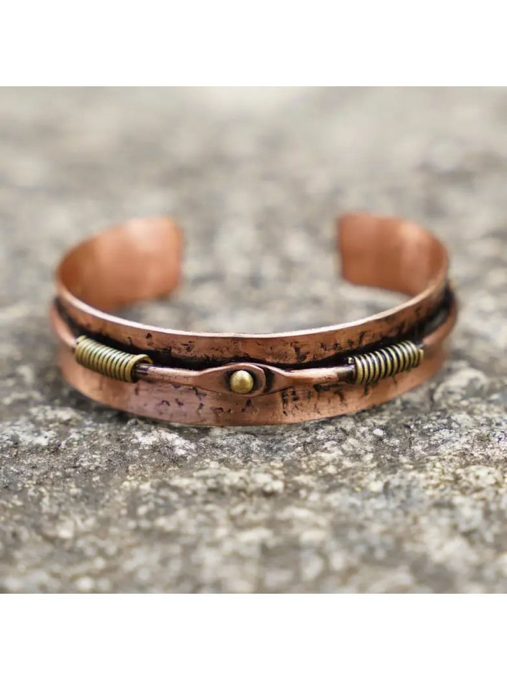 Изготовленный вручную из латуни и меди, этот браслет несет в себе тепло традиций и заземляющую энергию натуральных металлов.